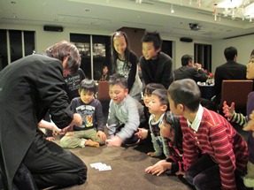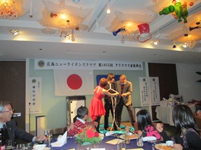 本格的なマジックショーを楽しみ、子どもたちにはサンタに扮する会長、幹事からクリスマスプレゼントが手渡されました。