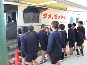 6年生2クラス55名の児童が、教室で薬物乱用防止のDVDと講義を受けた後、キャラバンカーへ移動して、みんな熱心に勉強しました。
