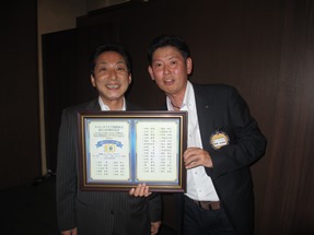2015年度クラブ優秀賞バナーパッチ・ピンの伝達と100周年記念会員増強賞ピンの伝達をしました。